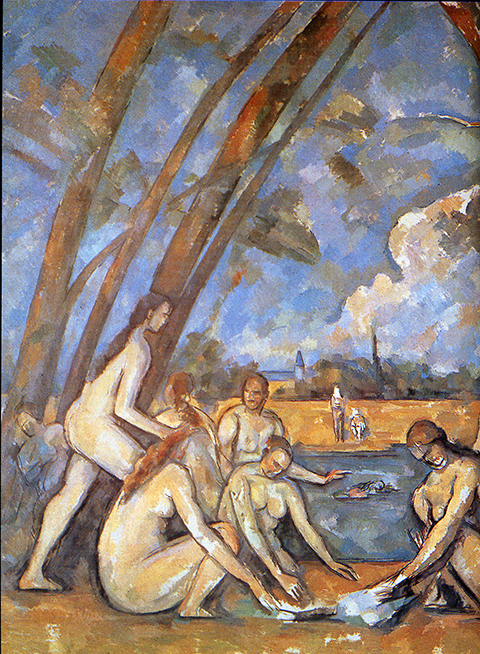 Saltuari furono invece i soggiorni all’Estaque, il quartiere marsigliese caro già agli impressionisti, ma oggi snaturato dal paesaggio industriale. Il centro di Aix-en-Provence invece, è rimasto quello di una volta. Elegante, ricco, gonfio di palazzi patrizi e botteghe d’antan e affollato di studenti: quarantamila, su centotrentamila abitanti, per lo più dediti agli studi di legge perché Aix vanta da secoli la seconda Corte di Giustizia più importante di Francia. Sopra: a destra particolare delle Bagnanti e a sx Tholonet, caffé Cézanne